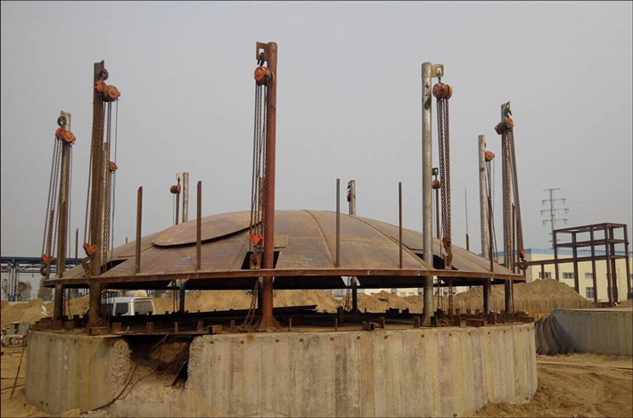 在焊接油罐的第一步就是需要對油罐的整體重量有正確的計算,一般選定電動葫蘆的總額定重量為油罐整體重量的1.3-1.5倍以上。確定焊灌電動葫蘆臺數(shù)后,要精確計算和確定吊點的間距,個各吊點間距一定要相等且均衡布點。由于施工工藝上要求少開天窗,因此首先吊點要盡可能少,除要求首次吊點的間距一致外,還要考慮以后吊點的均衡設(shè)置,以保持各吊點的間距相等,盡可能為電動葫蘆的均載運行創(chuàng)造條件。根據(jù)以往的施工經(jīng)驗,首次吊點一般為選定電動葫蘆總臺數(shù)的一半,第二次吊裝施工完畢后,即在吊裝第三層前要及時補進其余所有吊點立柱,掛上整套焊灌電動葫蘆,全部投入第三層的吊裝運行。