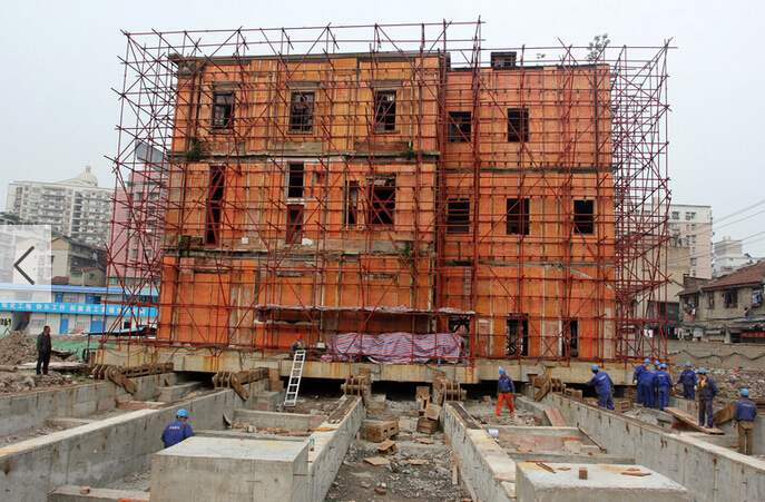 2016年4月27日,湖北武漢,屹立了近百年的老房子漢口義勇消防聯(lián)合會(huì)舊址大樓,順著6條鋼筋混凝土軌道,整體向東平移。