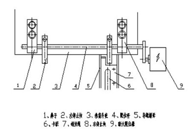 導(dǎo)繩器在有繩槽的卷筒上,隨卷筒轉(zhuǎn)動(dòng)而作軸向移動(dòng),以保證鋼絲繩在卷筒上排列整齊。當(dāng)?shù)蹉^上升到級(jí)限位置時(shí)(吊鉤外殼與卷筒外殼之間的離距應(yīng)≥500mm),導(dǎo)繩器裝置的卡板磁撞右停止塊,推動(dòng)限位桿往右移動(dòng),從而切斷電機(jī)電流。當(dāng)?shù)蹉^下降到極限位置時(shí)。導(dǎo)繩器裝置的卡板碰撞左停止塊,推動(dòng)限位桿往左移動(dòng),從而切斷電機(jī)電流,這樣確保的電動(dòng)葫蘆安全行。導(dǎo)繩器裝置和限位裝置示意圖見(jiàn)圖10。