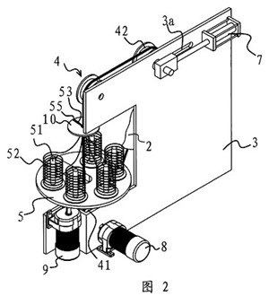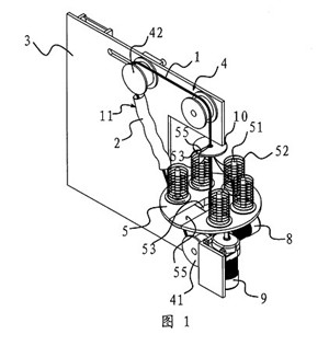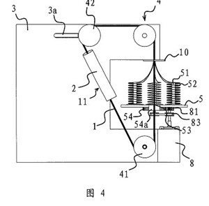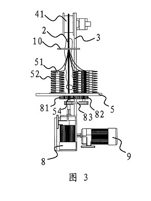 一種環(huán)形穿絲吊裝帶的生產(chǎn)裝置,它包括一塊固定板(3),在固定板(3)上設(shè)有用于撐開環(huán)形穿絲吊裝帶(11)的滾輪組(4),滾輪(41)驅(qū)動裝置與其中至少一個滾輪(41)相聯(lián)并可通過該滾輪(41)帶動環(huán)形絲吊裝帶(11)轉(zhuǎn)動,其特征在于,所述的固定板(3)的側(cè)部設(shè)有一個轉(zhuǎn)盤(5),在轉(zhuǎn)盤(5)上設(shè)有若干個用于放置線團(52)的線架(51),轉(zhuǎn)盤(5)具有一個供撐開在滾輪組(4)上的環(huán)形穿絲吊裝帶(11)進(jìn)入并垂直穿過轉(zhuǎn)盤(5)中心的缺口(53),上述轉(zhuǎn)盤(5)與一個當(dāng)撐開在滾輪(41)組(4)上的環(huán)形穿絲吊裝帶(11)轉(zhuǎn)動時可帶動轉(zhuǎn)盤(5)上的各個線架(51)繞環(huán)形穿絲吊裝帶(11)轉(zhuǎn)動的轉(zhuǎn)盤(5)驅(qū)動裝置相聯(lián)接,所述的轉(zhuǎn)盤(5)驅(qū)動裝置包括一個與電機一(8)相聯(lián)的主驅(qū)動齒輪(81),在轉(zhuǎn)盤(5)的底部中心設(shè)有一個與主驅(qū)動齒輪(81)相嚙合的轉(zhuǎn)動齒輪(54),轉(zhuǎn)動齒輪(54)具有與轉(zhuǎn)盤(5)上的缺口(53)上下對應(yīng)的開(54a),在轉(zhuǎn)動齒輪(54)旁還設(shè)有一個副驅(qū)動齒輪(82),所述的副驅(qū)動齒輪(82)通過同步傳動帶(83)與主驅(qū)動齒輪(81)相連。