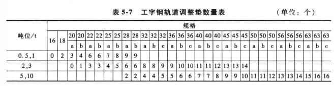 2、根據(jù)選用工字鋼型號規(guī)格的不同,調(diào)整電動小車的墊圈數(shù)量,要保證兩側(cè)輪緣與工字鋼間要有3-5mm的間隙。工字鋼軌道調(diào)整墊數(shù)量見表5-7.