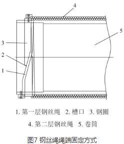 由于第一層鋼絲繩和第二層鋼絲繩在卷筒上有高度差(即鋼絲繩直徑差),使得在卷筒上固定時(shí)不能很好的固定,故需在卷筒上鋼絲繩固定端焊接一鋼圈,鋼圈上開一槽口,將第一層鋼絲繩穿過槽口用壓繩器固定在卷筒上,第二層鋼絲繩用壓繩器固定在鋼圈外表面上完成整個(gè)電動葫蘆的繞繩。如圖7所示。