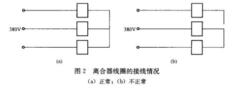 從圖2(a)可以看出,正常的情況下,3個(gè)線圈的電壓都是220V,3個(gè)線圈都能正常地吸合,離合器也能正常的離合,上升和下降時(shí)電動(dòng)機(jī)能正常地工作,但在有一個(gè)線圈的一端脫離中點(diǎn)后,中點(diǎn)就不存在了,見圖2(b)。3個(gè)線圈中,一個(gè)線圈沒有電壓,另兩個(gè)線圈的電壓為380/2V=190V,每個(gè)線圈雖說有190V,但這兩個(gè)線圈是串聯(lián)的,不能保證兩個(gè)線圈的阻抗是相等的,這時(shí)3個(gè)線圈都不可能正常地工作,造成了離合器不能正常地勤離合。離合器的工作不正常,就造成了電動(dòng)葫蘆上升和下降時(shí)的阻力增大,電動(dòng)機(jī)就不能正常的工作工作,電動(dòng)葫蘆就不可能正常的上升和下降了。