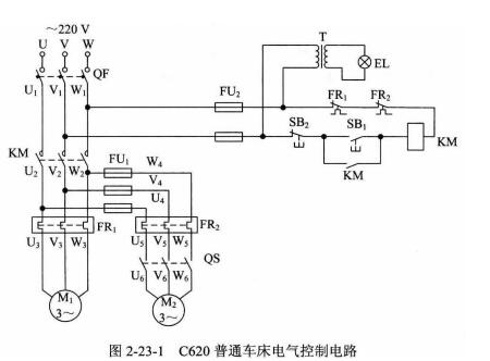 C620普通車床電氣控制電爐如圖2-23-1所示,M1,M2為容量小于10kw的電動(dòng)機(jī),采用全壓直接起動(dòng),均為單方向旋轉(zhuǎn)。M1由接觸器KM實(shí)現(xiàn)起動(dòng)、停止控制,M2由轉(zhuǎn)換開(kāi)關(guān)QS控制。M1、M2分別由熱繼電器FR1、FR2實(shí)現(xiàn)電動(dòng)機(jī)長(zhǎng)期過(guò)載保護(hù),由熔斷器FU1、FU2實(shí)現(xiàn)M2電動(dòng)及、控制電爐及照明電爐的短路保護(hù)。照明電爐由變壓器T供給電壓,控制照明燈