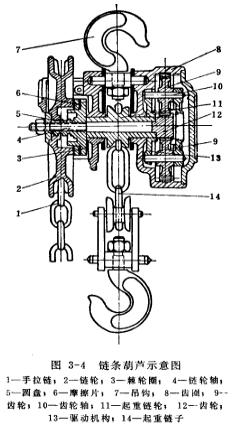 圖3-4為齒輪式手拉鏈條葫蘆。當提升重物時,手拉鏈1使鏈輪2按順時針方向轉(zhuǎn)動。鏈輪2沿著圓盤5套筒上的螺紋向里一動,而將棘輪圈3和摩擦片6都壓緊在鏈輪軸4上(鏈輪軸4與圓盤5牢固形成一體),棘輪圈3只能順時針方向轉(zhuǎn)動,棘爪在棘輪圈3上跳動發(fā)出嗒嗒之聲。鏈輪軸4右端的齒輪12帶動齒輪9(或稱行星齒輪)與固定齒圈8相嚙合,使齒輪9沿鏈輪軸4為中心順時針方向移動。同時帶動驅(qū)動機構(gòu)13和起重鏈輪11轉(zhuǎn)動,使起重鏈子14上升。當不拉手拉鏈之后,重物是靠自重產(chǎn)生的自鎖現(xiàn)象和棘爪組織棘輪圈3逆時針方向轉(zhuǎn)動而停止在空中。反之,當松下重物時,手拉鏈1使鏈輪2和圓盤5分離。則鏈輪軸4右端的齒輪12帶動齒輪9與固定齒圈8相嚙合,使齒輪9沿鏈輪軸4為中心逆時針方向轉(zhuǎn)動,同時帶動驅(qū)動機構(gòu)13和起重鏈輪11轉(zhuǎn)動,使起重鏈子14下降。當不拉手拉鏈之后,因鏈輪2停止轉(zhuǎn)動時,起重鏈輪11受重物自重還要繼續(xù)沿逆時針方向轉(zhuǎn)動,行星齒輪傳動機構(gòu)同樣沿逆時針方向繼續(xù)轉(zhuǎn)動,使圓盤5、摩擦片6及棘輪圈3相互之間相互壓緊而產(chǎn)生摩擦力,棘輪圈3受棘爪阻止不能向逆時針方向轉(zhuǎn)動,于是摩擦力作用在螺紋上產(chǎn)生自鎖,使重物停止在空中。