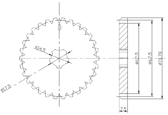 根據(jù)葫蘆傳動(dòng)齒輪低速重載,根據(jù)手拉葫蘆傳動(dòng)結(jié)構(gòu)的原理由五尺長(zhǎng)軸的小齒輪帶動(dòng)片齒輪甲、乙,考慮到五尺長(zhǎng)軸的小齒輪齒數(shù)甚小等特點(diǎn),1.5型葫蘆選用了齒形角20°的漸開線特種片齒輪變位齒輪,其基本齒形的基本參數(shù)如圖所示。選用齒形是考慮了以下因素:1.5t葫蘆傳動(dòng)齒輪的小齒輪齒數(shù)甚少為了避免根切和增強(qiáng)度,只能用正變位切削這樣小齒輪的外圓就受齒條的正切力,片齒輪與短軸屬于過硬配合,片齒輪的中心要設(shè)計(jì)出與短軸尺寸屬于硬配合的小花鍵孔尺寸如圖所示: