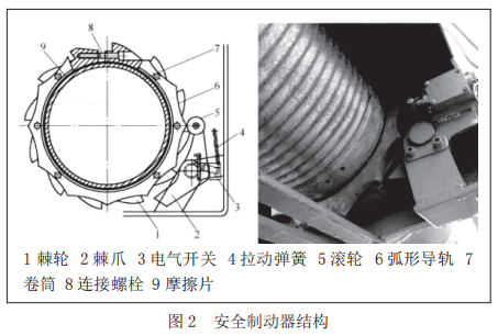 超速保護(hù)裝置中提到了安全制動器,其結(jié)構(gòu)型式見圖2。標(biāo)準(zhǔn)規(guī)定當(dāng)起重機(jī)額定起重量大于5t時,電動葫蘆除設(shè)置一個工作制動器外,還應(yīng)設(shè)置安全制動器,且設(shè)置在電動葫蘆的低速級上(當(dāng)起重機(jī)額定起重量小于或等于5t時,也宜在低速級上設(shè)置安全制動器,否則電動葫蘆應(yīng)按1.5倍額定起重量設(shè)計),并要求在正常作業(yè)時,安全制動器應(yīng)在高速軸制動器閉合后延時閉合,其延時動作時間可調(diào),進(jìn)行緊急制動時,安全制動器應(yīng)立即動作。