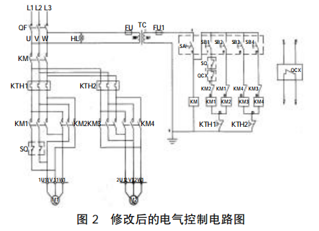 (1)急停開(kāi)關(guān)不能切斷總電源。解決對(duì)策:更改原電動(dòng)葫蘆的控制電路,增加一個(gè)能斷開(kāi)總電源的接觸器。急停開(kāi)關(guān)是帶自鎖的按鈕開(kāi)關(guān),不能自動(dòng)復(fù)位。實(shí)施方案:原控制箱的電器元件已老化,箱體內(nèi)無(wú)法增設(shè)接觸器。因此,從長(zhǎng)遠(yuǎn)考慮,為了保證質(zhì)量,更換電器控制箱是一個(gè)最佳方案。圖 2 為修改后的電氣控制電路圖,KM 是能斷開(kāi)總電源的接觸器。對(duì)于不能更換控制箱的電動(dòng)葫蘆,必須增加控制電源接觸器。