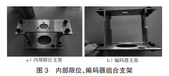 為了滿足在緊湊的環(huán)鏈葫蘆殼體內(nèi)部加裝機械限位開關(guān)、編碼器的需求,需要根據(jù) ABUS 環(huán)鏈葫蘆自帶原裝限位開關(guān)的外觀尺寸以及編碼器的安裝尺寸來設(shè)計加工固定支架。支架部件間采用可調(diào)節(jié)連接方式,立支架兩側(cè)開挖空檔,便于人工手動調(diào)整限位開關(guān)。內(nèi)部限位、編碼器組合支架如圖 3 所示。